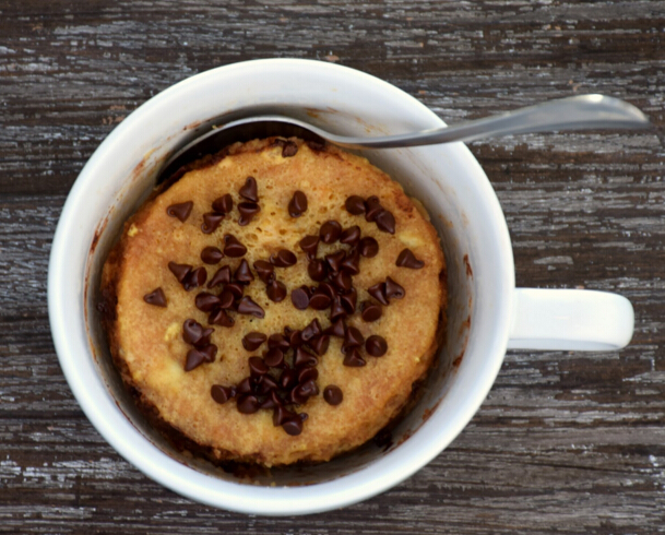 1.In a small bowl, whisk together flour and baking powder. Whisk in the rest of the ingredients (except chocolate chips) until well-combined.