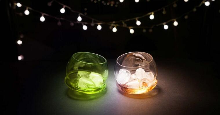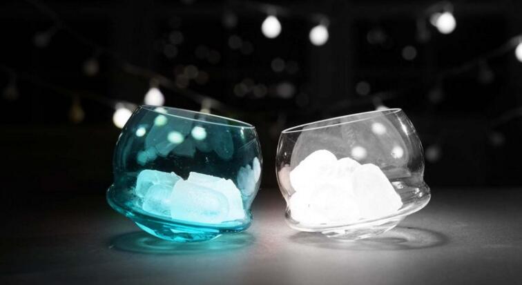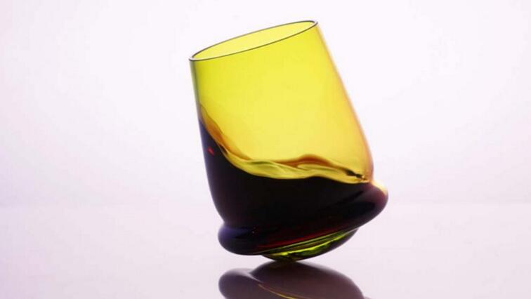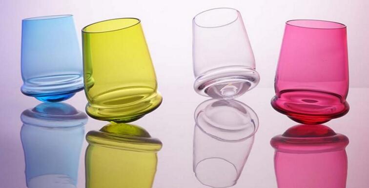 The glasses rock back and forth on a curved base, but never fully tip over due to a ‘safety ring’ around the body.