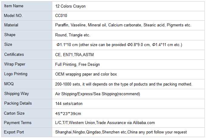Item Name is 12 Colors Crayon.Model NO. is CC010.And Material is Paraffin, Vaseline, Mineral oil, Calcium carbonate, Stearic acid, Pigments etc.
