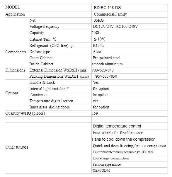 Features:1.Win several national patents2.Using brand DC compressor,with 3 years warranty.3.Automatically low voltage cut out to protect batteries4.Wide working voltage range: 10.5V~42.5V5.Application : solar energy ,boat,commecial,etc.6.Cooling performance:45min to -18oC at 45oC room temperature7.DC compressors manufacture for more than 10 years.8.No AC Inverter needed9.Environmentally friendly CFC-free refrigerant (R-134a/R-600a)10.High temperature resistance and energy saving design11.Low power consumption makes best use of available power12.Using AC110/220V power through AC/DC adaptor