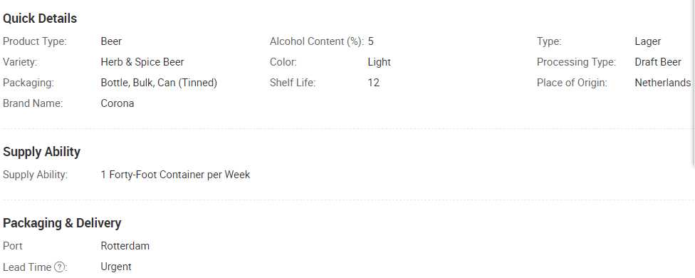 Alcohol Content (%): 5 Type: Lager Variety: Steam Beer Color: Light Processing Type: Champagne Beer Packaging: Bottle, Can (Tinned) Shelf Life: 12 Weight (kg): 0.330 Name: corona Beer: DrinkProduct Type: Beer