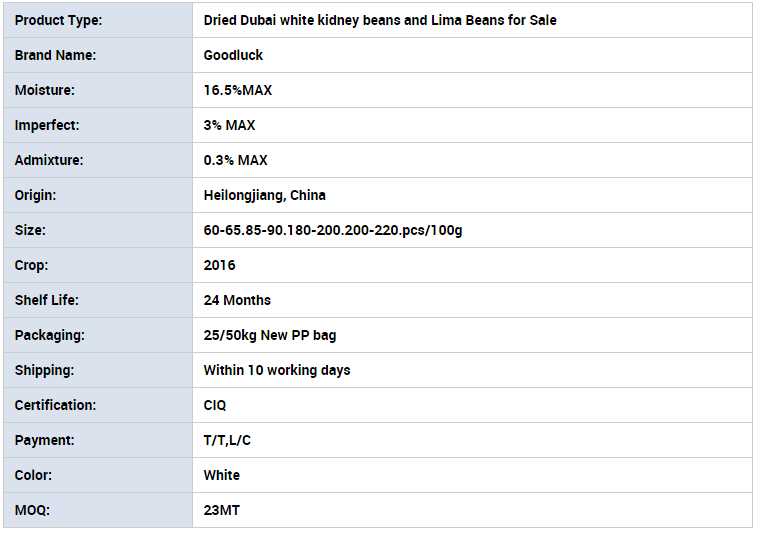 Dried Dubai white kidney beans and Lima Beans for Sale1. 25/50kg New Paper bag2. 25/50kg New PP bag3. as buyer's requirementForeign language print on the packaging and Wooden pallets are available23 tons white kidney beans in 20GP container.store in a cool, dry place and keep away from strong direct kidney beans can be safely stored for 24 monthes