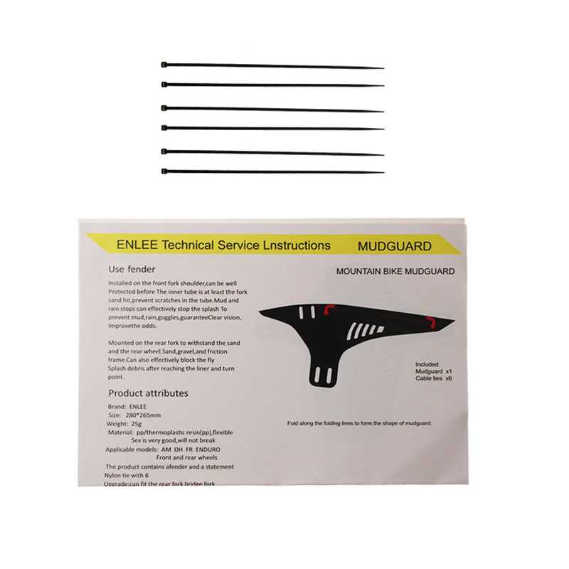 Basic parameters Brand: ENLEE Model: EN01 Material: PP Weight: about 30g / piece Specifications: length 26.5cm Packing: OPP transparent sealing pocket (with fender x1 manual x1 cable tie x6)