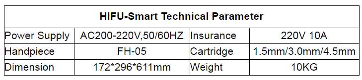HIFU-smart:1.5mm cartridge, 3.0mm cartridge, 4.5mm cartridge,4.5mm cartridge 13.0mm cartridge and one HF-05 handle.