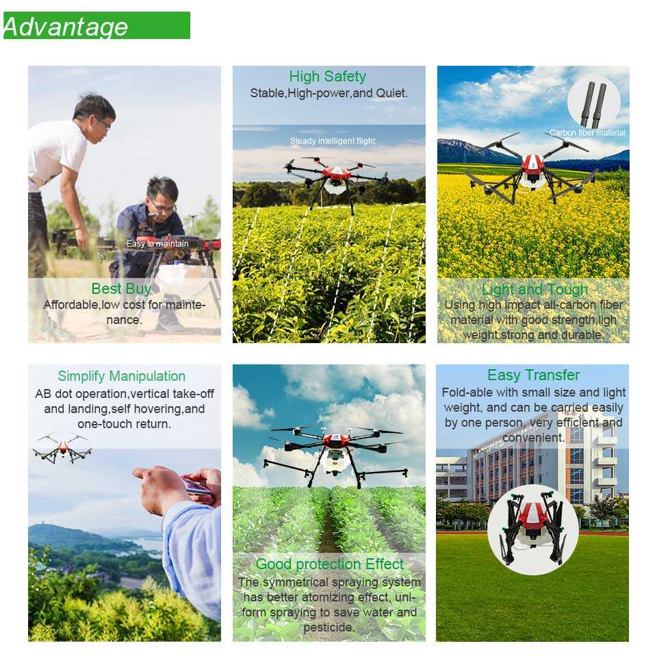 Carbon fiber structure, durable and portableHigh efficiency dynamic systemStable flight, good wind resistanceHigh safety, long service lifeA group of batteries are capable for two cruisesConvenient transfer with fold-able rotor and sprayerAuto cruise, resume cruise, smart flow controlAuto lost-control protection systemSimplified manipulation and maintenance with low cost