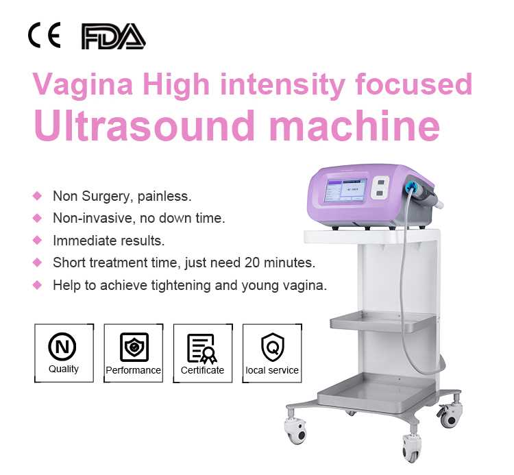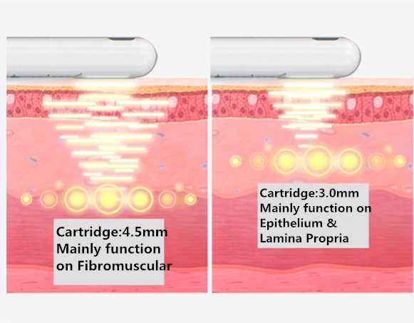 Vagina HIFU is a non-surgical and a non-laser procedure that adopts High Intensity Focused Ultrasound technology, with different depth of catridges (4.5mm, 3.0mm), directly localize vagina submucous fiber,pelvic floor muscle layer and pelvic floor fascia layer. It contracts the fiber and fascia layer, exercising muscle layer and sponge with the Mechanical wave heating effect, promoting the metabolism and repairing capability of the whole inner wall of vagina. Relieving and sloving vaginal relaxation could be reached aiming at vaginal tissue fracture and relaxation.