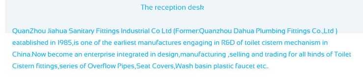 QuanZhou Jiahua Sanitary Fittings Industrial Co Ltd (Former:Quanzhou Dahua Plumbing Fittings Co.,Ltd ) eatablished in 1985,is one of the earliest manufactures engaging in R&D of toilet cistern mechanism in China.Now become an enterprise integrated in design,manufacturing ,selling and trading for all kinds of Toilet Cistern fittings,series of Overflow Pipes,Seat Covers,Wash basin plastic faucet etc..