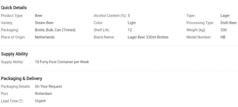 We are able to supply varieties of beer with unlimited quantity and consistent supply such as Budvar, Brands Budweiser, Pilsner Urquell, Stella, Erdinger, Loewenbrau, Paulaner, Franziskaner, Hoegaarden, Warsteiner, Guinness, Grolsch, Lech, Tyskie, Miller, Peroni, Magners, Moretti, Newcastle, Sol, Chimay, Duvel, Corona, Desperados, Fosters, Kronenbourg, Strongbow, Somersby, Woodpecker, John Smith’s, WKD, Smirnoff Ice, Bacardi Breezers and Effes on EXW Hamburg Port. Order by mix containers.