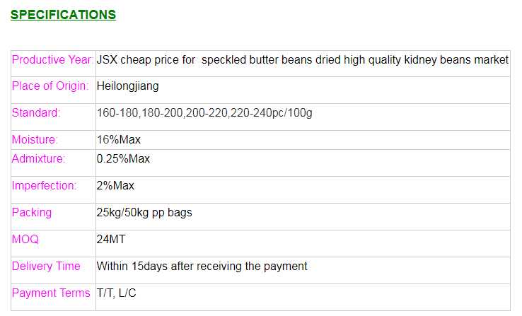 JSX cheap price for speckled butter beans dried high quality kidney beans market