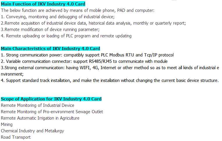Internet of Thing means connecting all of the objects and internet by means of information recognition device such as load cell, and thus achieve intelligent recognition or management. Based on IOT concept, we build our own IKV intelligent management system, while IKV Industry 4.0 Card is the core of such system.
