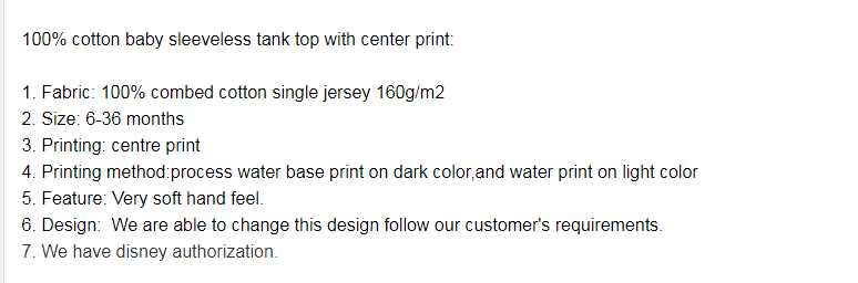 our baby T-shirts have high quality fabric,have three distinctive features:breathable ,skin care and soft.before bulk production we will send bulk fabric sample,label sample,accessories samples to our clients,so we can make sure that our products have the highest level of materials.secondly,all of our products will pass the needle checking machine before packing.thirdly,we will send you the shipping sample which could reflect all bulk garments quality for you to approve quality of bulk garmenns.what's more,we have extra sevices,includes:1.the products are meeting all of the safety standrad for baby.2.we promise,the reasonable prices,short production tinme and satisfactory after-sales sevices.3.we promise all of our products :no fade,soft,natural and environmental,100% cotton.
