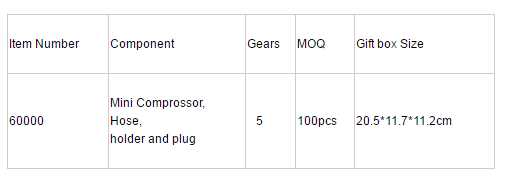 Product Parameter1)Voltage: DC12V 2) Pressure: 21PSI3) Air output per min./litres: more than 16L/min4) Hose : 2m5) Weight: 0.7kg 6) Size: 13.6*10.2*6.6cm 7)Sound:Quiet, vibration free