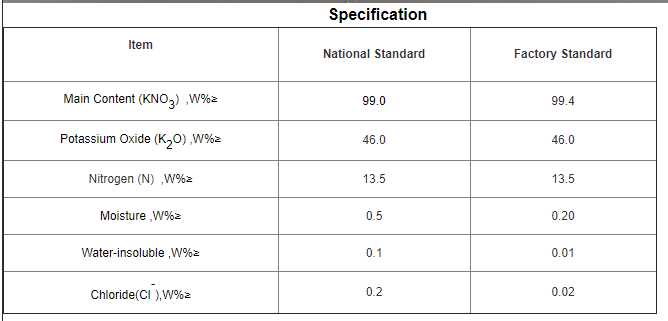 White or colorless crystalline fertilizer . Fully soluble in water, easy absorbing, high efficiency. Suitable for all crops ,contains high concentration of both potassium and nitrogen. Nitrogen as nitrate anion (NO3-), the most available form of nitrogen for plant uptake. It contains high K2O, which will strengthen the plant immune system.