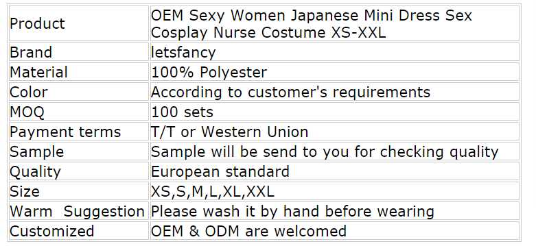 OEM Sexy Women Japanese Mini Dress Sex Cosplay Nurse Costume XS-XXL Packing item : 1)opp bag 2)PVC bag with hanger 3)PE bag with hanger