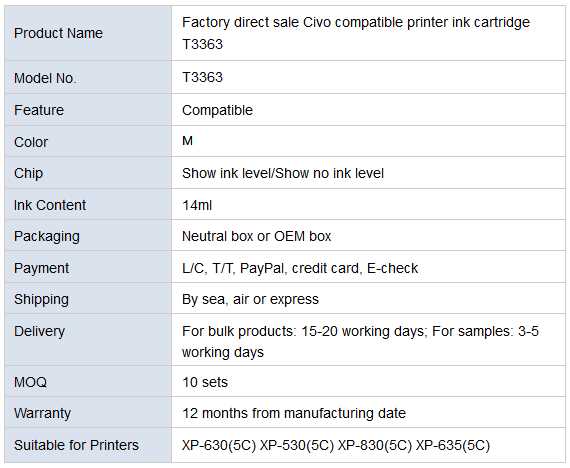 Color:M, M Brand Name:Civoprint or OEM Model Number:T3363 Product name:Factory direct sale Civo compatible printer ink cartridge T3363 Quality:Excellent Warranty:12 months from manufacturing date Certification:ISO9001/ISO14001