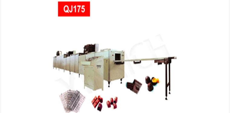 QJ175 chocolate depositing line is an advance equipment for the chocolate deposited products. It is comprised of activities of mould drying, depositing, vibrating, cooling, de-moulding, and transporting in one unit ,and it is automatically controlled by a PLC.