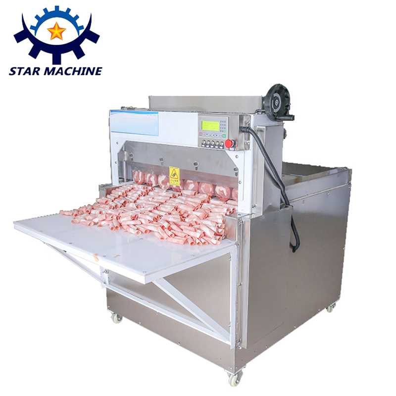 Automatic meat slicer machine for frozen meat slicing machine and bacon cutter1.Products without thawing can be cut on the machine, reducing your waiting time.2.High degree of automation, simple operation, all functions are used point switch, easy and fast3. Safe operation, the product cut out of the meat through the food conveyor belt with automatic output. The operator could grab the meat without hand. A cover was equipped in front of the cuttting knives. When the protective door is open, the cutter will automatically power off to stop running. The cutter can not run unless the security door was shut. Double safety protection, to ensure safety.4.Slice fast, high production efficiency, 60 times per minute knife speed.5.Cut out the meat roll thickness uniform, neatly arranged, the size has been.6.Small size, light weight, easy to move. Slicer and conveyor belt for the split, small footprint, conveyor belt length can be adjusted, easy maintenance.