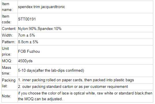1. Stretch or rigid raschel lace trim, jacquard lace trim, textronic lace trim.2. Stretch or rigid lace fabric.3. 100% cotton trim, cotton / nylon / spandex / metal blended trim.