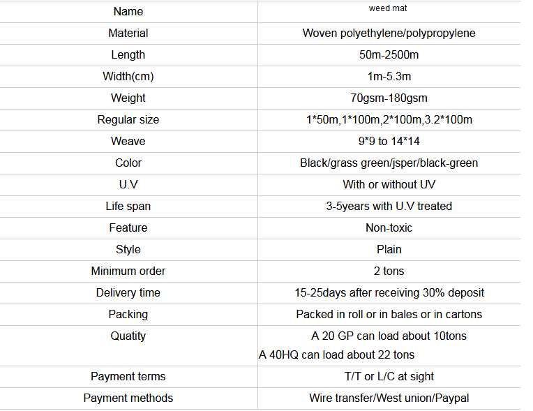 Our weed mat is made of high density 100 GSM woven PP(polypropylene) sheets with UV inhibitors, which has outstanding resistance to UV light and can last for more than 10 years. This fabric can also use under beds, paving, decking, patio, etc.weed mat can prevent weeds without chemicals, ecology safe alternative to herbicide use. Great for agriculture, landscape and garden.Our weed barrier fabric is made of 3oz/sq.yd (100gsm) high density woven polyproylene, Enviromental-Friendly Allows water, air and nutrients to penetrate slowly, can decrease watering needs.