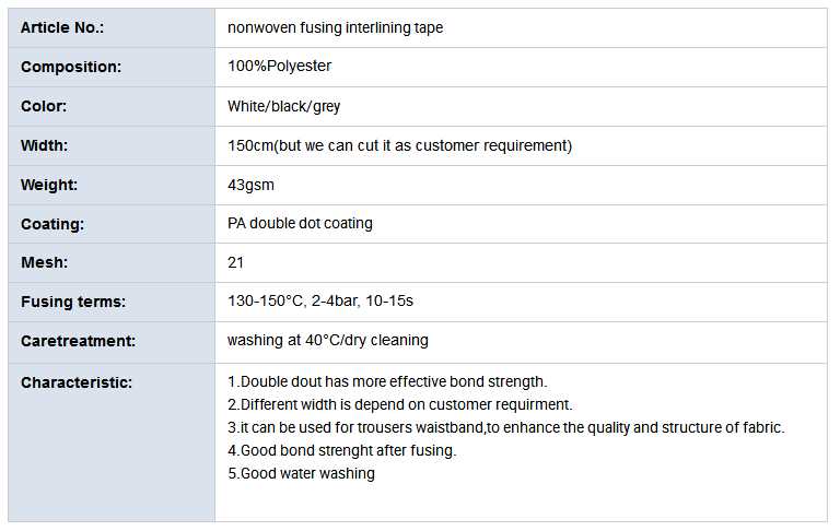 Our company has a 10,000-square-meter standard workshop, equipped with advanced 3 double-dot production lines,as well as 1 powder-dot production lines and 2 Dyeing and finishing lines. This guarantees the high quality of our products. We have more than 100 different specifications of products. At present, our annual production capability is 50,000,000 meters of interlinings.We have established a new dyeing and finishing workshop. Thus, we can control the quality, develop new items and increase the efficiency and output.As a customer oriented enterprise, we have been devoted to providing high quality products and the first class service for clients. To meet the customer's requirements, we have set up more than 10 offices in Beijing, Tianjin, Shanghai, Hangzhou, Ningbo, Wuhan and Yangzhou. On the basis of mutual efforts and benefits, our firm believes that credibility and customers are our top concerns, and we have won the trust of clients both at home and abroad. If you are interested in any of our products, please do not hesitate to contact us for further information.