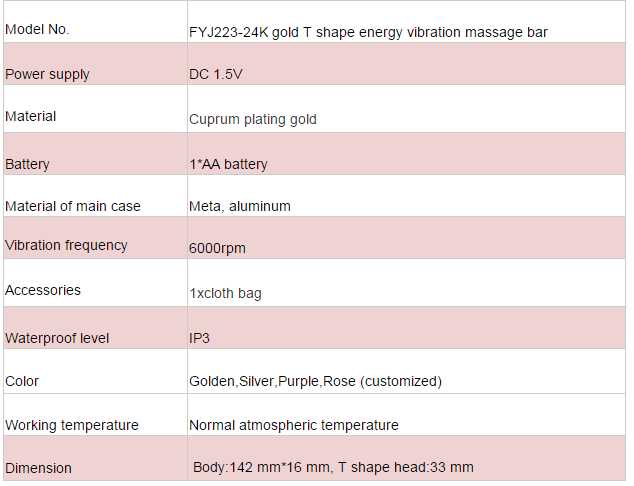 Product Description1. A T-shaped facial tool that is plated in 24k gold & emits 6000 micro-vibrations per minute, which greatly enhances blood circulation and healing properties onto skin disorders.2. The combination of the gold ions & the micro-vibrations stimulate facial muscles & in turn, tightens, lifts & contours the skin.3. Easy to use -- wash your face & apply your moisturizer or serum as normal. Use the gold bar while your lotion is still damp & massage in upward strokes on your face for about 3-5 minutes (the longer you use, the better results you get).4. Coated in 24K Gold it adapts to any skin condition. You could use the beauty bar to give your face a quick lymphatic drainage massage. And it also helps reduce that morning facial puffiness and define your jaw & cheekbones.5. The Lift Bar works in combination with your favorite creams and lotion because it is more effective in massaging onto the skin pores versus your hands.