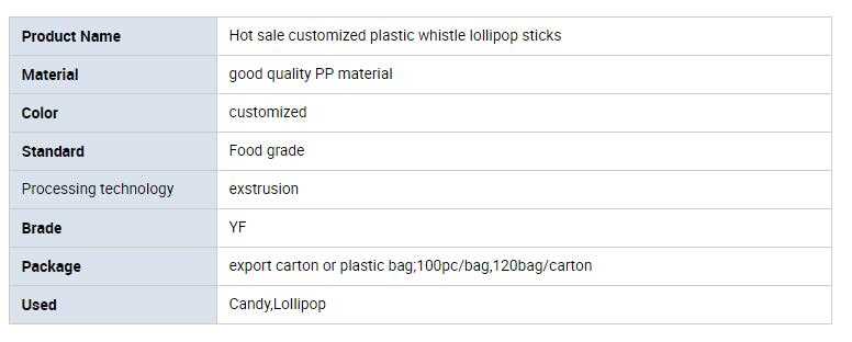 Hot sale customized plastic whistle lollipop sticks1. Size: 3.5X100mm or customized2. Standard: Food grade3. Certification: ISO9001, SGS, CE, ROHS